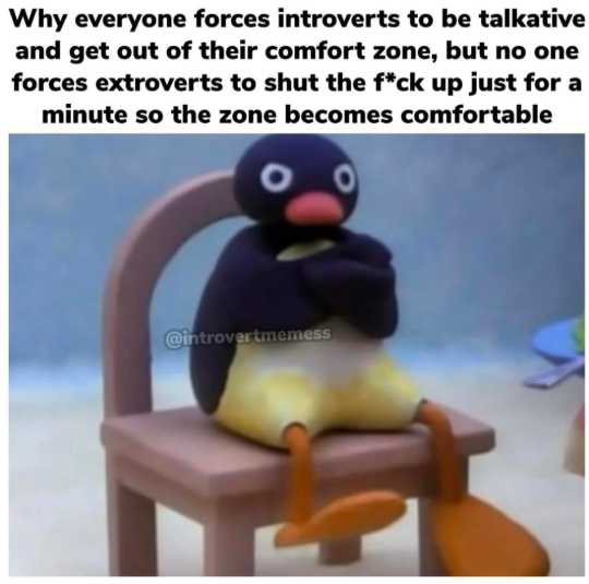 Az extrovertált a kapcsolódásból, beszélgetésből merít energiát. Az introvertált szívesebben tölt időt egyedül, ingermentes környezetben. Simon Sinek példája: az introvertált reggel 5 darab érmével a zsebében kezdi a napot, és minden egyes interakció egy érmébe kerül. Estére üres a zsebe. Az extrovertált üres zsebbel indul, minden interakcióból nyer egy érmét. Ez persze nem jelenti azt, hogy egy extrovertáltnak ne lenne szüksége egyedüllétre, és hogy egy introvertált ne vágyna tartalmas beszélgetésekre. Az arány a lényeg.
